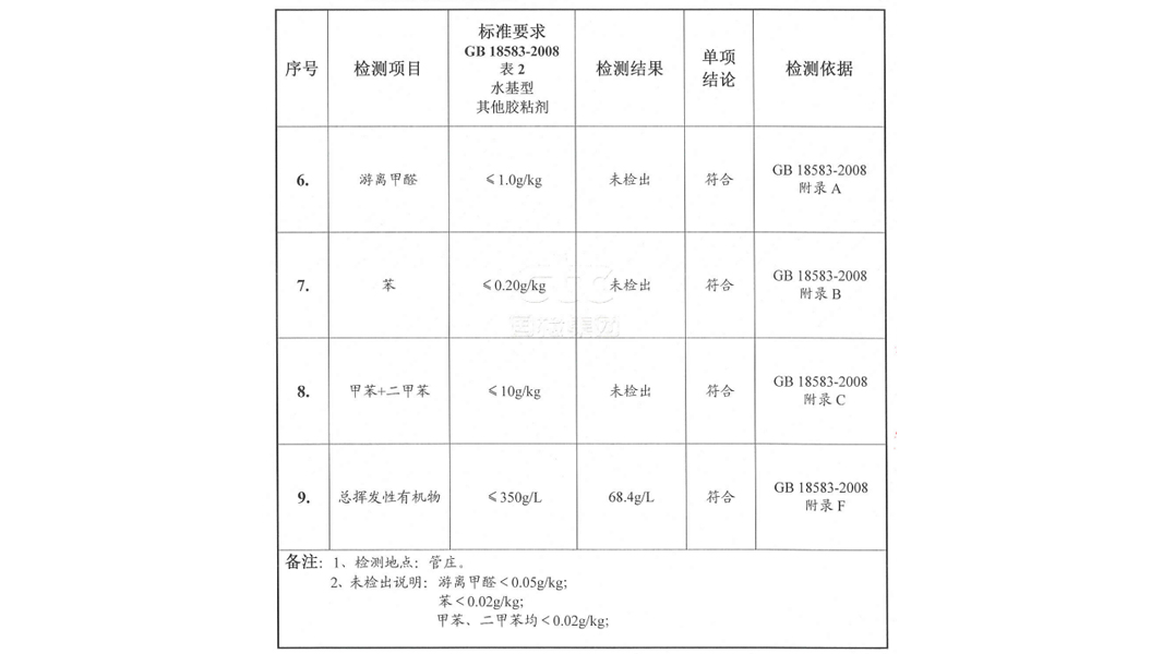 由于PVC塑膠地板廣泛使用在醫院、學校、幼兒園、養老院等人群聚集、氣味敏感、環保性要求“苛刻”的場所,因此目前對膠水的環保檢測也是異常嚴格,主要內容包括甲醛、苯、甲苯+二甲苯、TVOC。